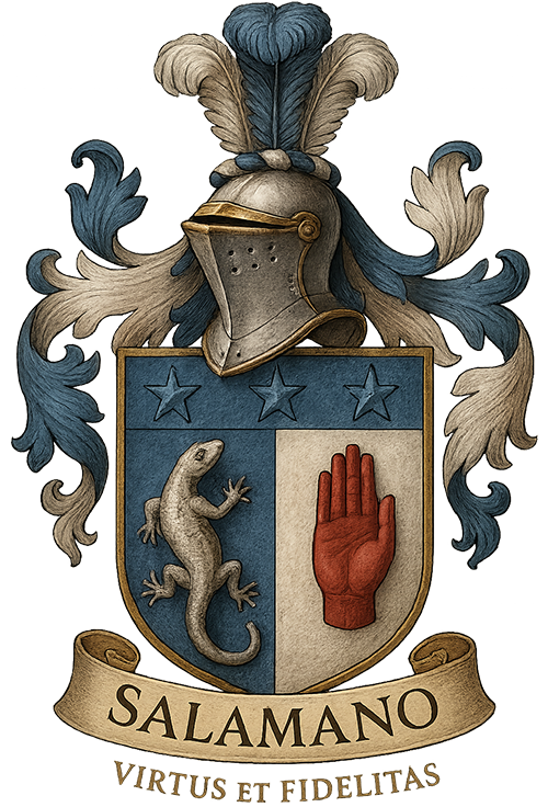 La salamandra d’argento, figura centrale nel campo azzurro, allude al mito antico della creatura capace di vivere tra le fiamme senza esserne consumata.Nella cultura simbolica europea, ciò rappresenta la resilienza dello spirito di fronte alle avversità e la capacità di rigenerarsi dopo le prove più ardue.In ambito araldico, la salamandra non è solo emblema di sopravvivenza ma anche di purezza e di rettitudine incorruttibile, poiché solo ciò che è puro può uscire illeso dal fuoco delle difficoltà.Accanto a questo simbolo si staglia la mano rossa, aperta e fiera sul campo d’argento, segno universale di lealtà, trasparenza e giustizia.